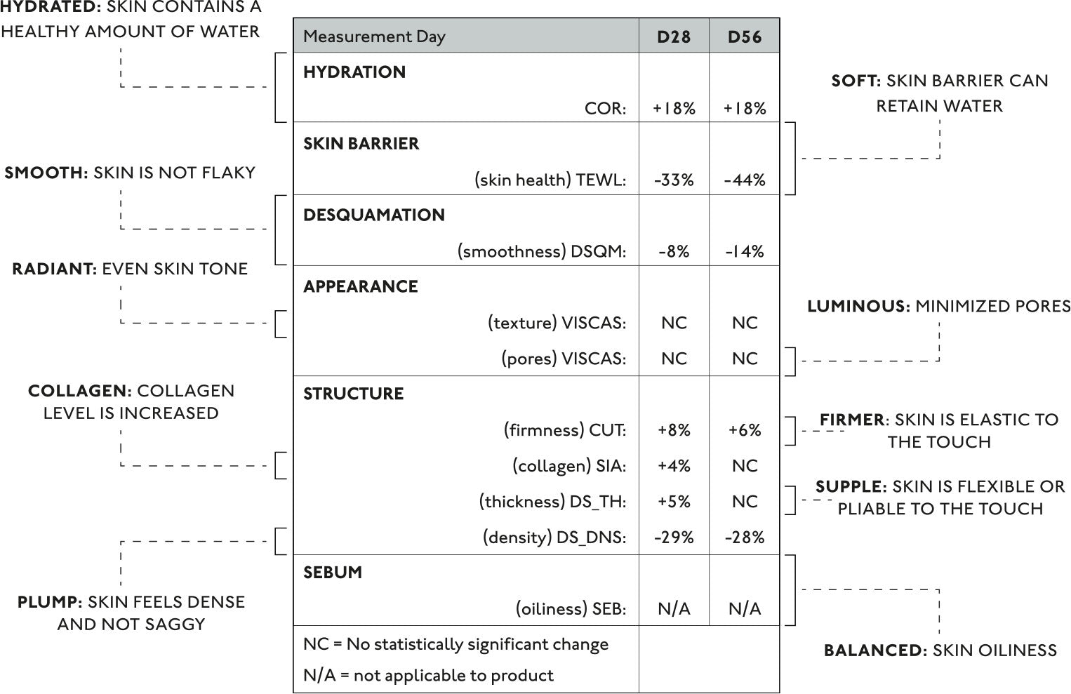 | Hydration | Hydrated | skin contains a healthy amount of water | Corneometer | Measure capacitance of skin (proportional to water content) |