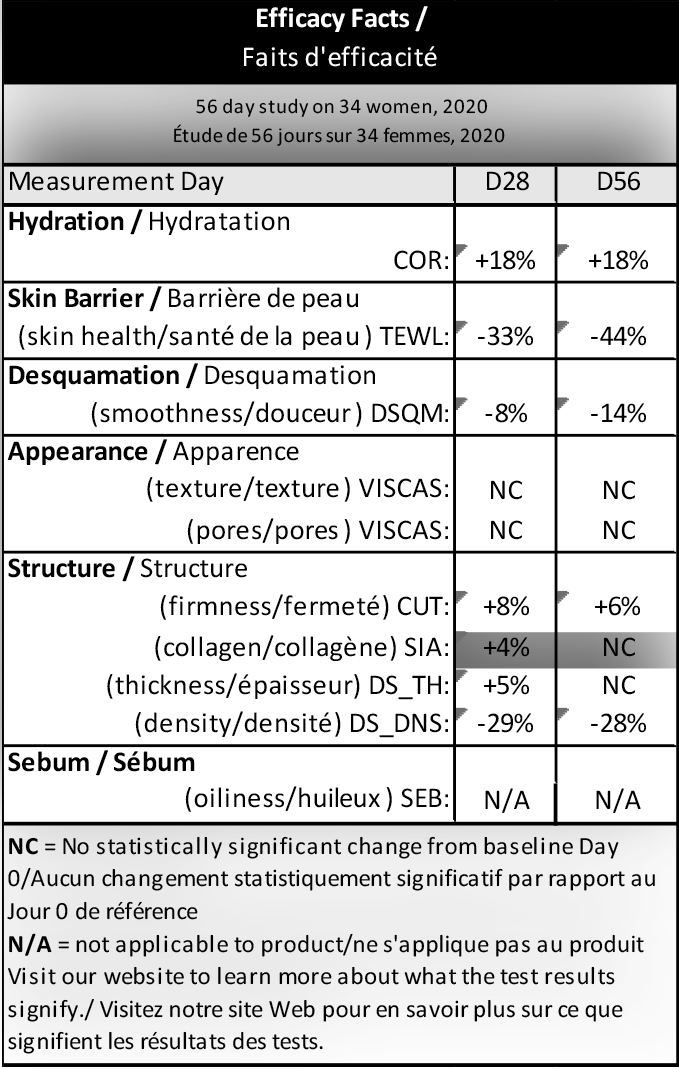 consumer in an easy-to-read format. An efficacy panel is shown on the left. The year of the study and the population used is summarized. Each skin parameter (and potential sub-parameter) and its measurement method is listed. The results as measured (e.g., changes on Day 28 and Day 56 as referenced to Day 0) are presented. If no statistical change was observed, this is recorded. If a parameter is not relevant to product claims, this is noted as “not applicable”. With this approach, not only positive results are shown, but also test results where no statistically meaningful result was achieved, or where a result was only temporary. Essentially, the panel provides a transparent snapshot of product performance.
